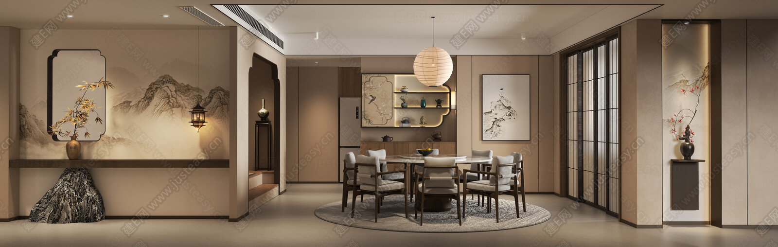 新中式宋氏餐厅玄关入户造景背景墙 3d模型下载