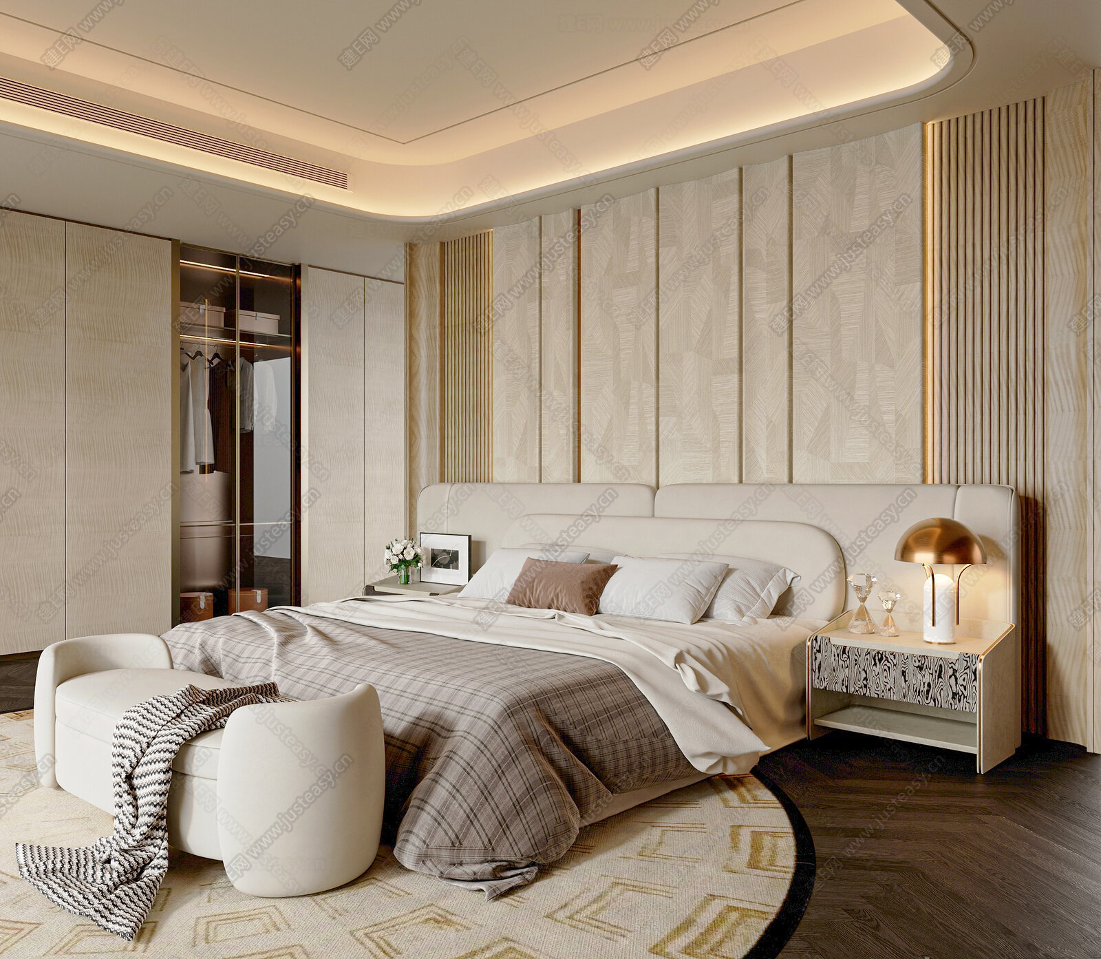 现代轻奢卧室 布艺双人床 轻奢床 床头背景墙 台灯 床头柜 床尾凳 3d模型下载